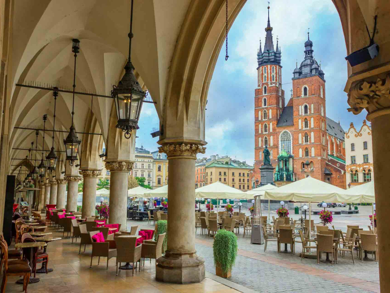 A Wawelből néhány perc sétával jutunk el Európa harmadik legnagyobb terére, a Rynekre. Itt található a régi kereskedőház, a Posztócsarnok, a régi Városháza, és Krakkó leghíresebb temploma, a gótikus Mária-templom benne a középkor híres nürnbergi fafaragó művészének, Wit Stwosznak műremek szárnyas oltárával. A templom tornyából óránként kürtszó hangzik fel. A tér páratlan hangulatáról művészek és zenészek gondoskodnak, gyakran díszes parádék keretei között.