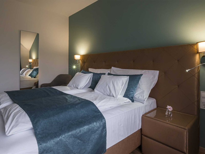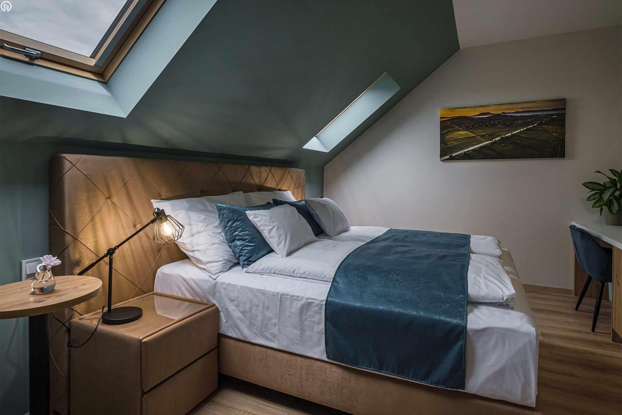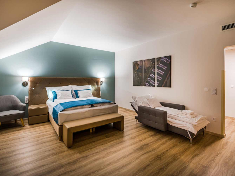 Összesen 19 standard szoba és 2 lakosztály található. A szobák tágasak, sok természetes fény szűrődik be köszönhetően a nagy ablakoknak, 17 szobához erkély is tartozik, a standard szoba 25 m2, a lakosztályok 80 m2-esek. A recepció mellett a földszinten található a mozgássérültek számára kialakított szoba.