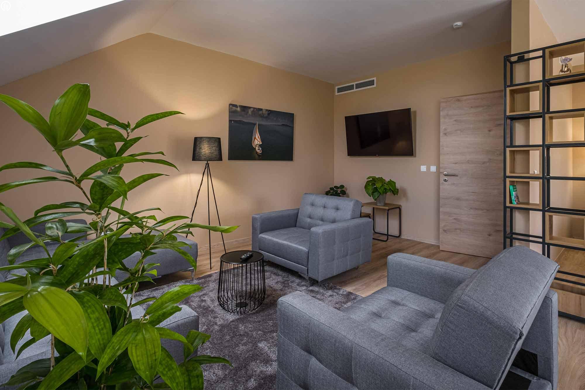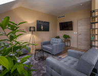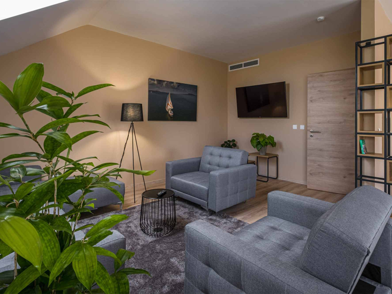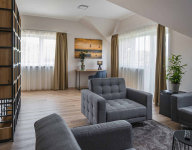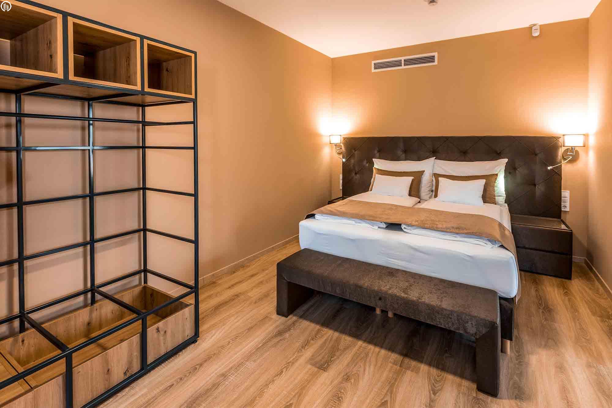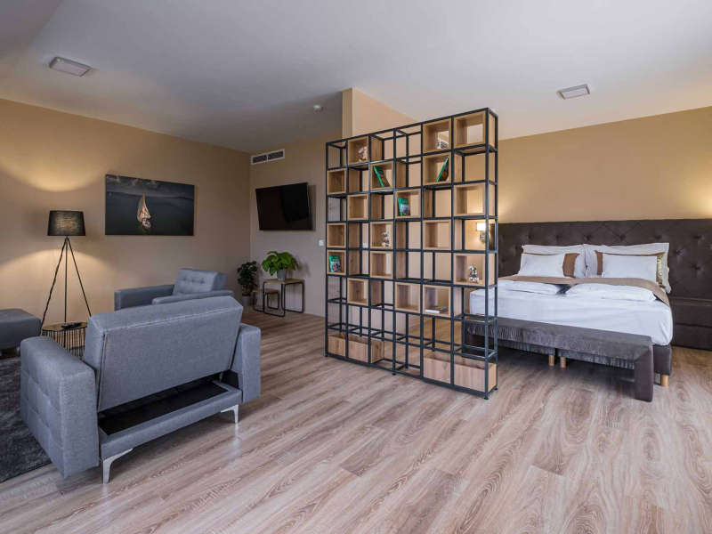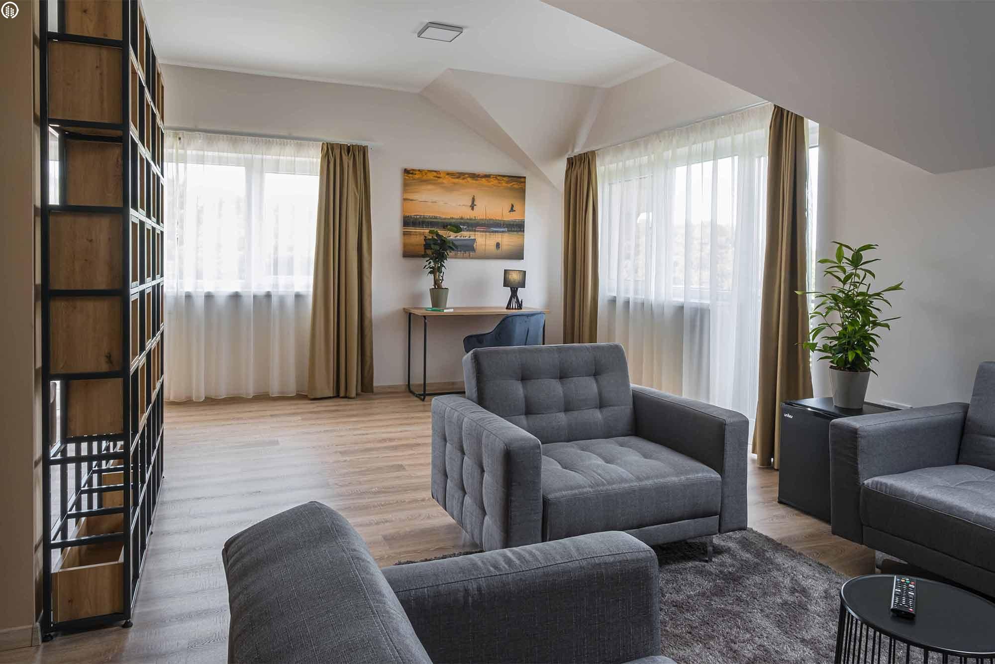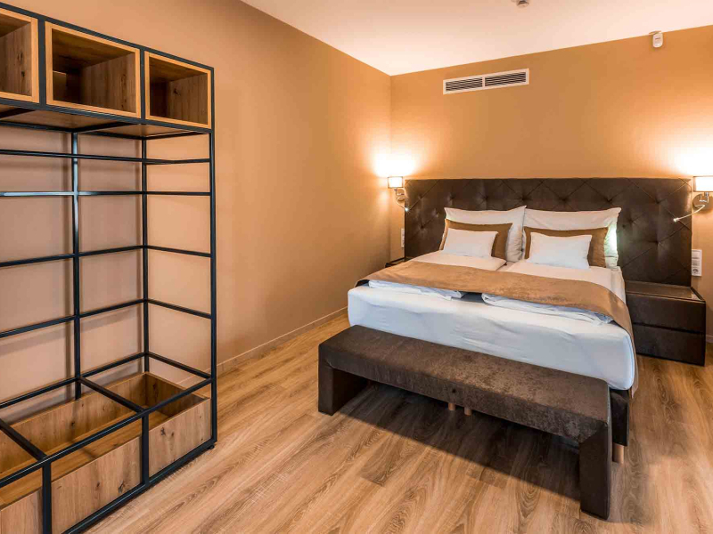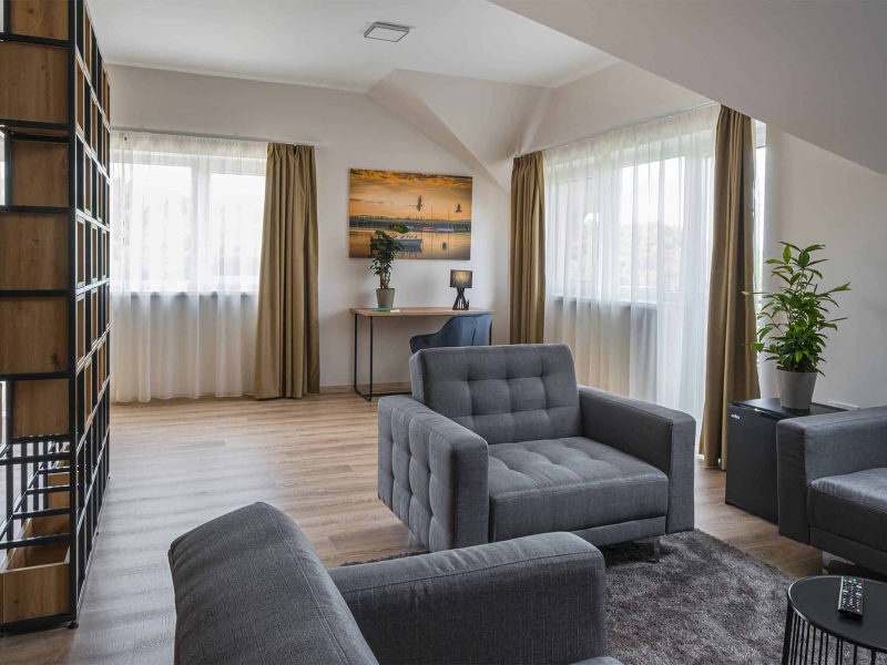 Összesen 19 standard szoba és 2 lakosztály található. A szobák tágasak, sok természetes fény szűrődik be köszönhetően a nagy ablakoknak, 17 szobához erkély is tartozik, a standard szoba 25 m2, a lakosztályok 80 m2-esek. A recepció mellett a földszinten található a mozgássérültek számára kialakított szoba.