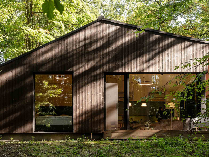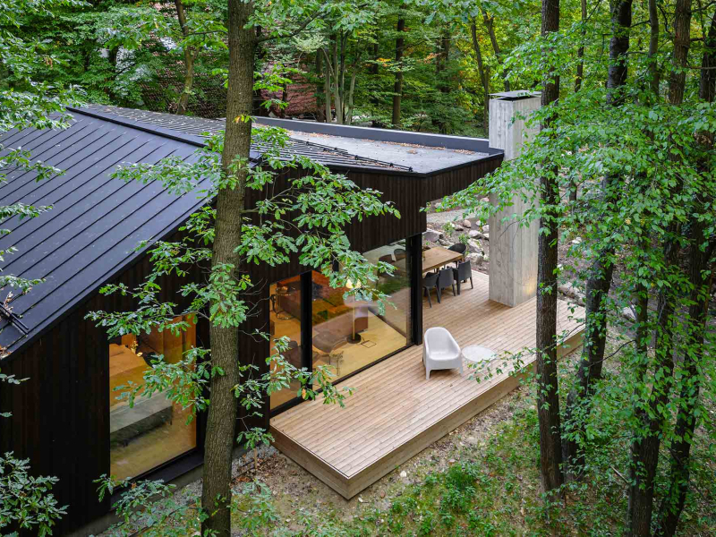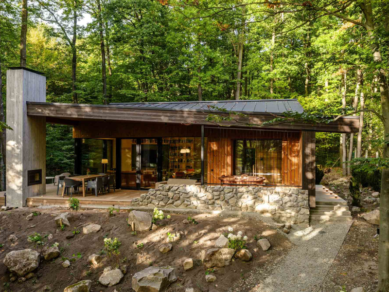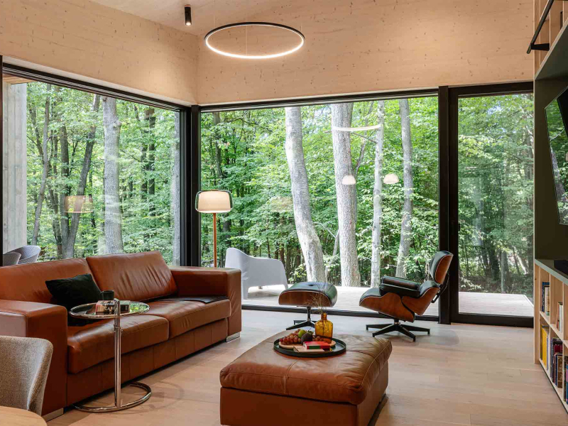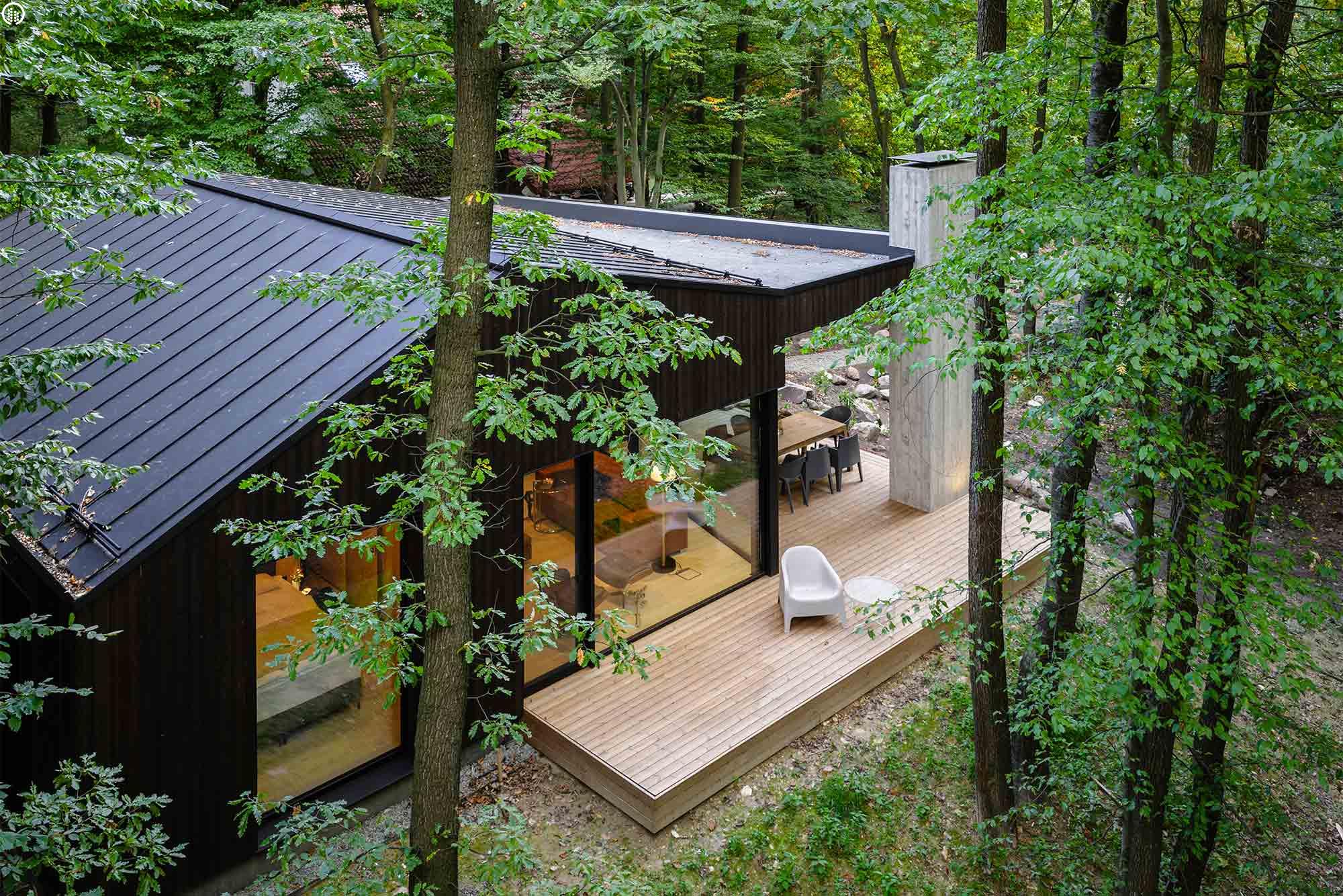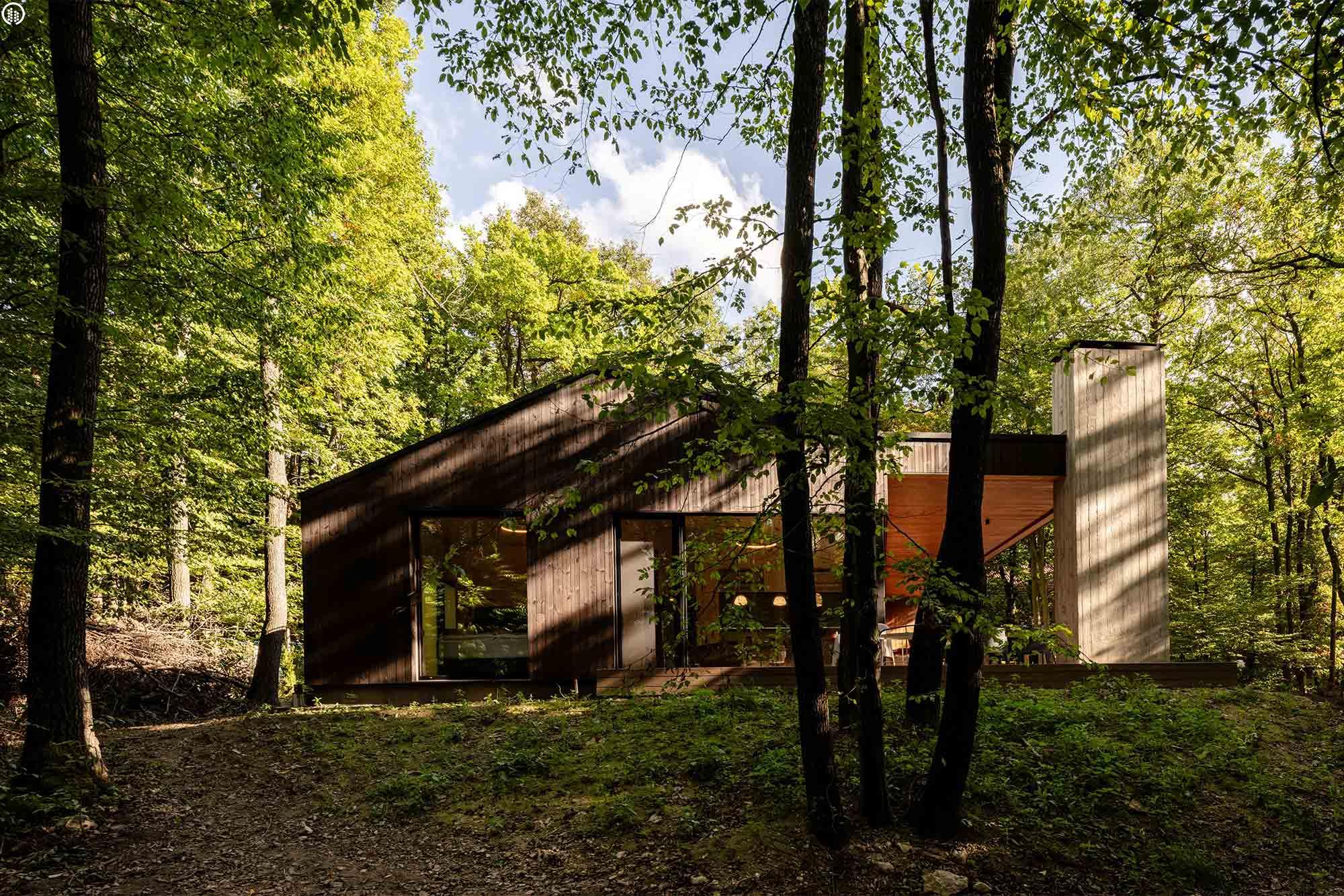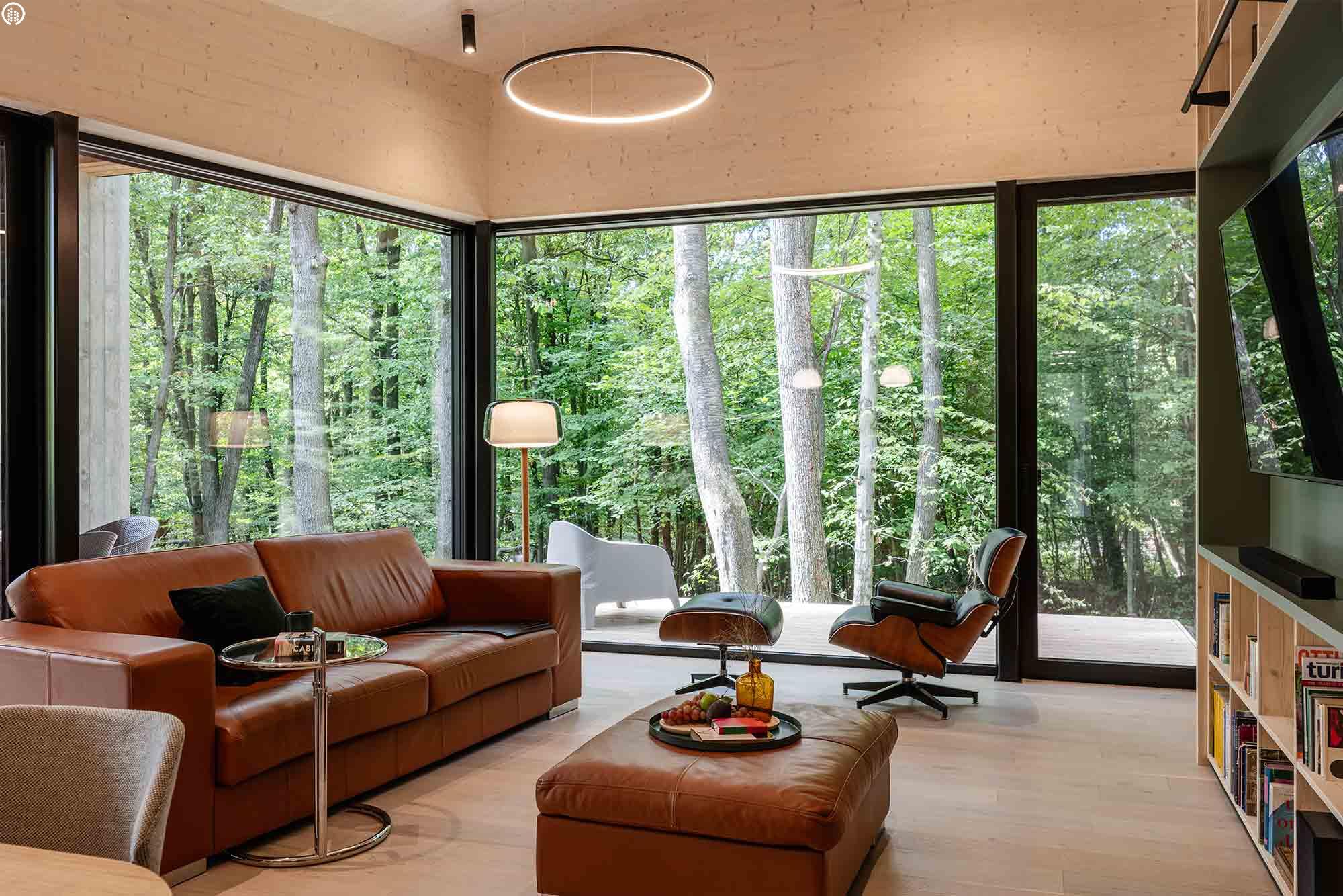 A luxus villa épület az erdő mélyén, egy túraútvonal mellett található, távol a városok és szomszédok zajától. Luxus a természetben - A prémium villa épület természetes anyagok felhasználásával épült egy erdő közepén, mégsem kell lemondanunk semmilyen kényelmi elvárásunkról.