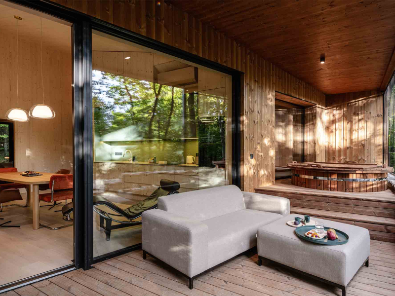 • Panorámás finn szauna, kültéri elektromos fürdő dézsa, stílusos és kényelmes szállás,