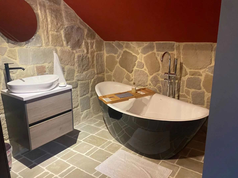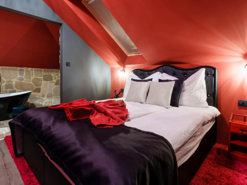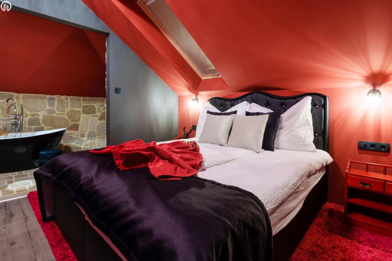 Ámor szoba exkluzív berendezéssel és egy óriási káddal került kialakításra, amely garantálja a romantikus, közös fürdőzéseket minden szerelmes pár számára. A szoba és fürdőszoba egy légtérben található, sajátos intim környezetet teremtve az itt eltöltött idő alatt.