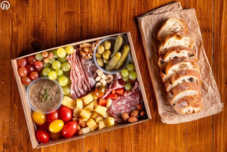 A Snac Box tartalma: Sós falatválogatás érlelt húsokkal – Coppa stagionata, Salame Napoli – válogatott svájci és holland sajtok, friss zöldségek és ropogós ciabatta.