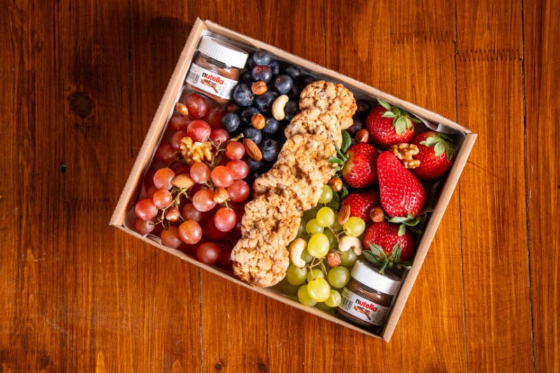A Fruit Box tartalma: friss idénygyümölcsök gondosan válogatott tálalásban, magvak, ropogós zabkeksz és két mini Nutella.