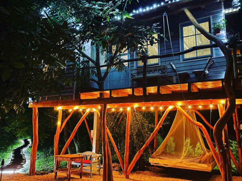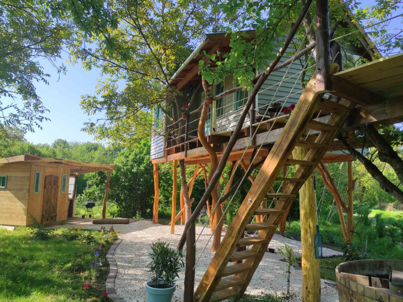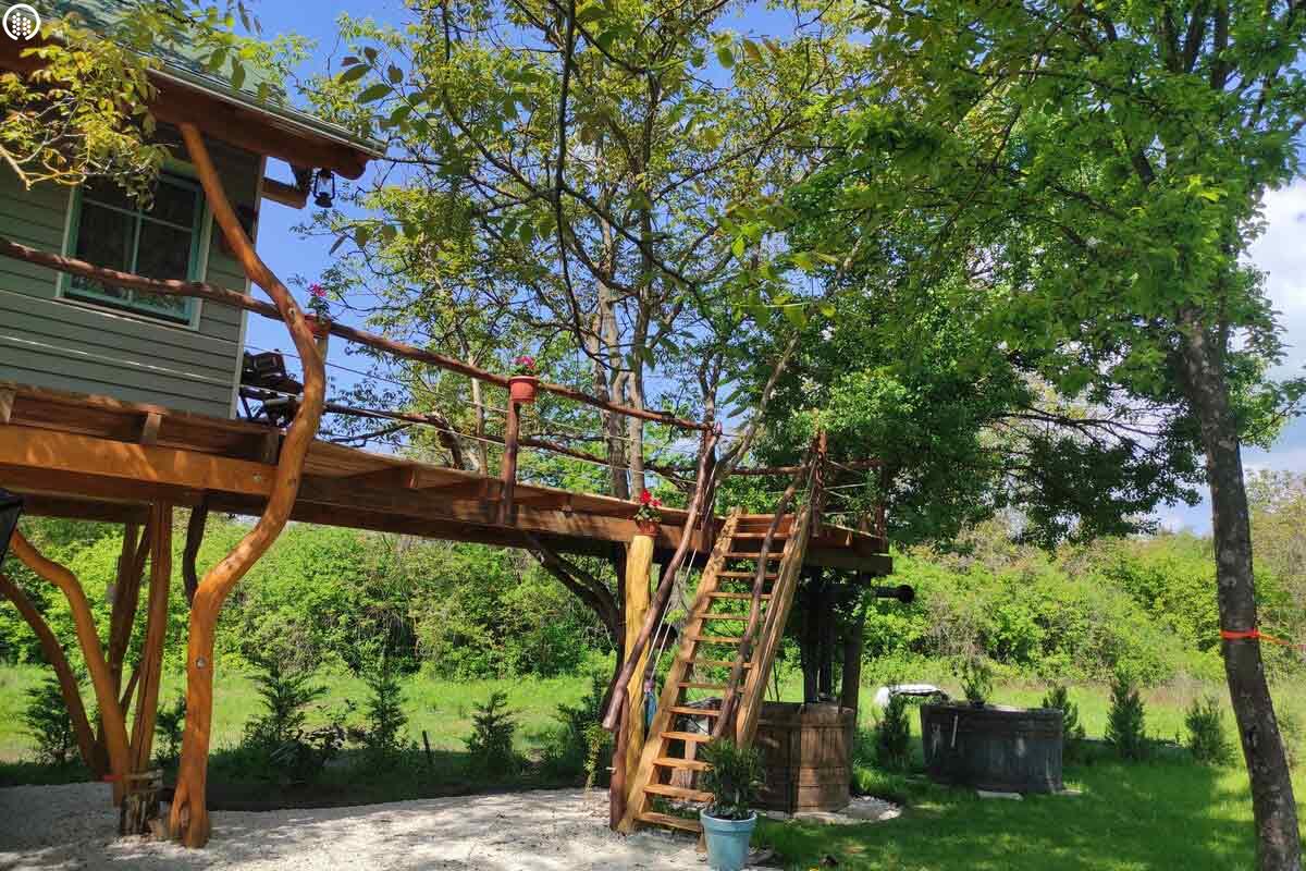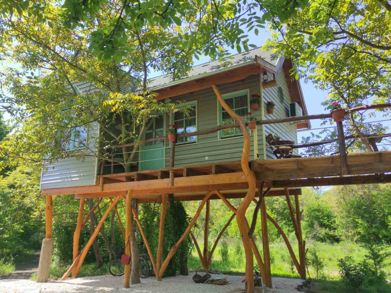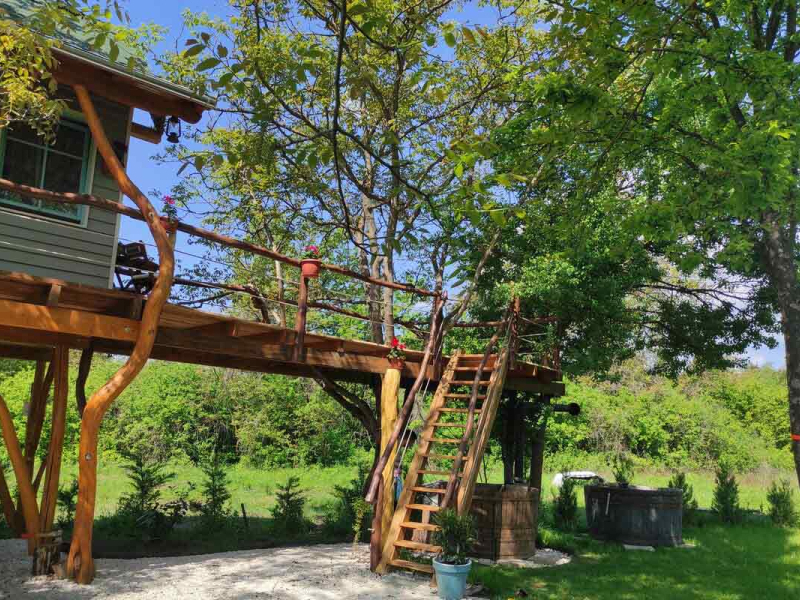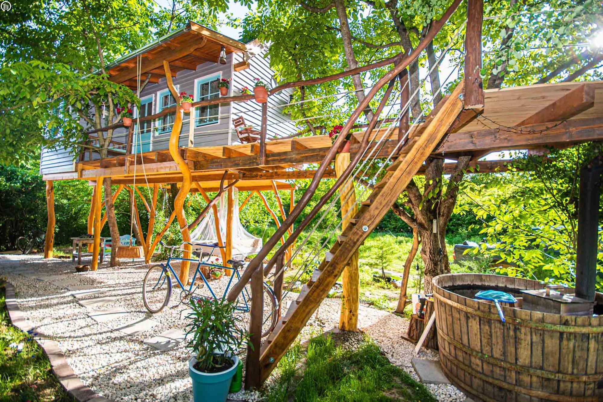 Igazi szerelmi fészek 3 méter magasan. A Dunakanyarban egyedülálló lehetőség, hogy élő fán tölthetitek az éjszakákat. Mindezt teljesen komfortos közegben, konyhával, fürdőszobával és fűtéssel, hűtő-fűtő légkondicionálóval felszerelt Lombházban. Élvezzétek egymás társaságát a levelek ölelésében a 25 m2-es teraszon, ahol még a nyári melegben is elviselhető az hőmérséklet. Az udvaron fatüzelésű, 5 illetve 2 személyes dészfürdő vár télen-nyáron, amihez egész évben biztosítjuk ingyenesen a tüzifát.