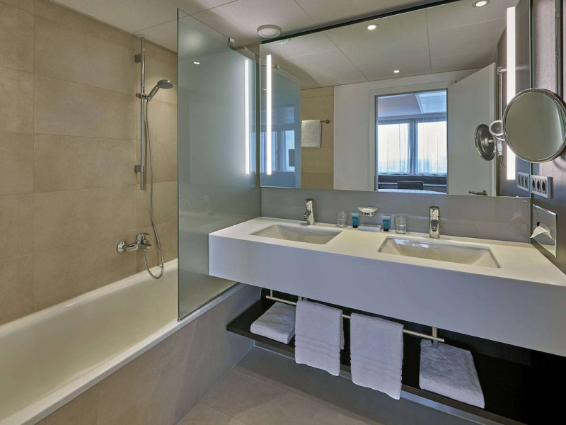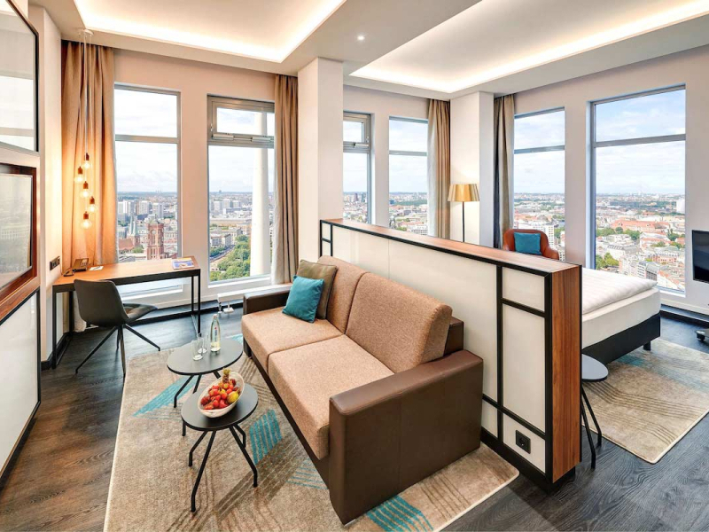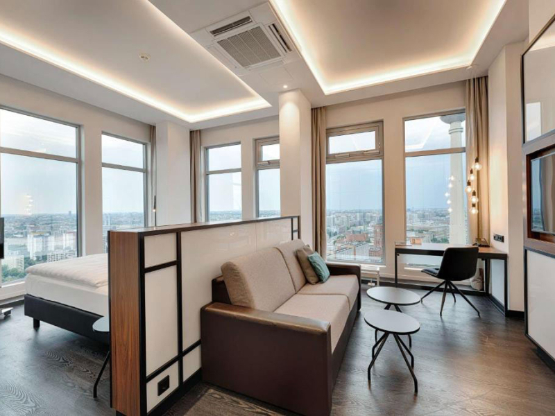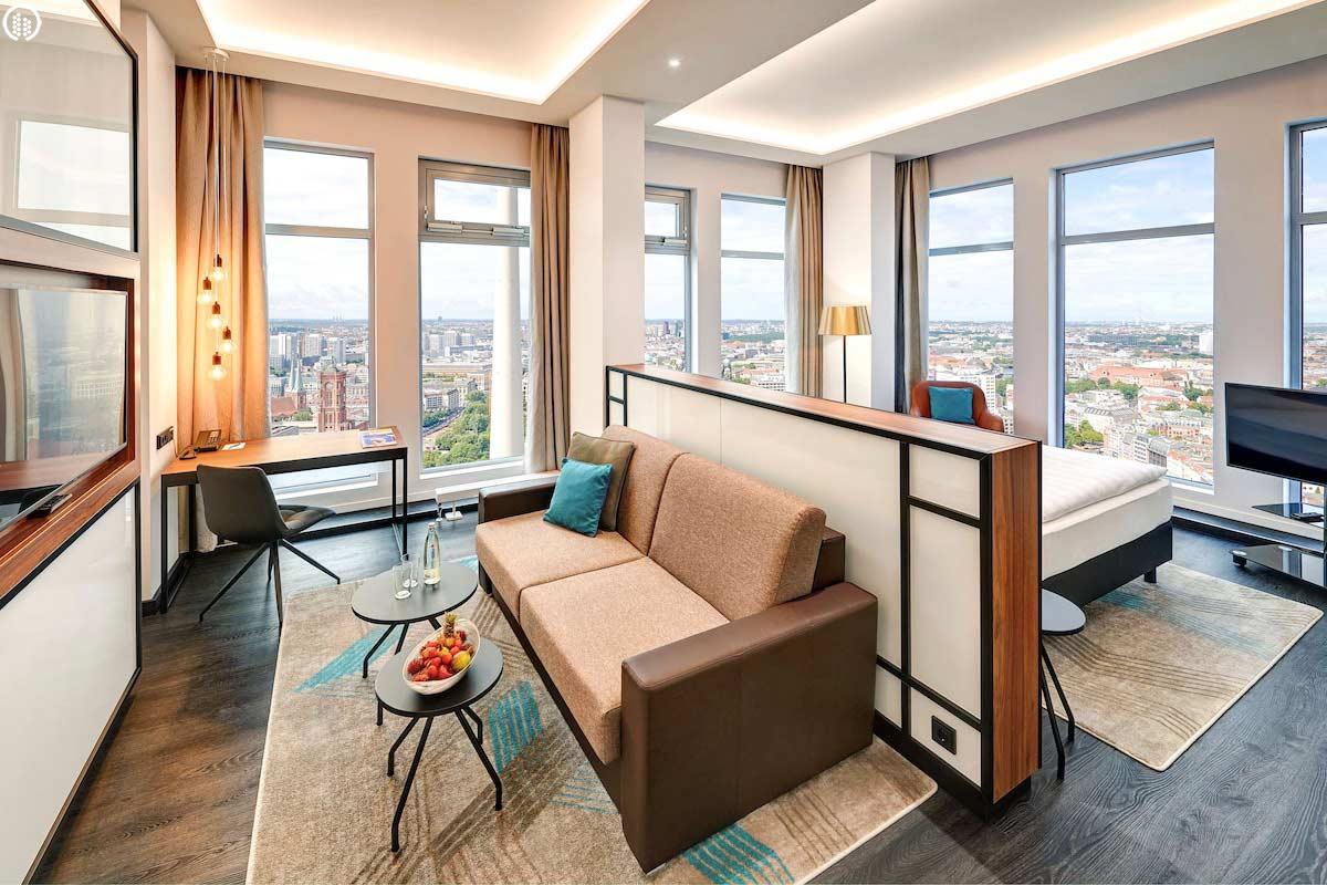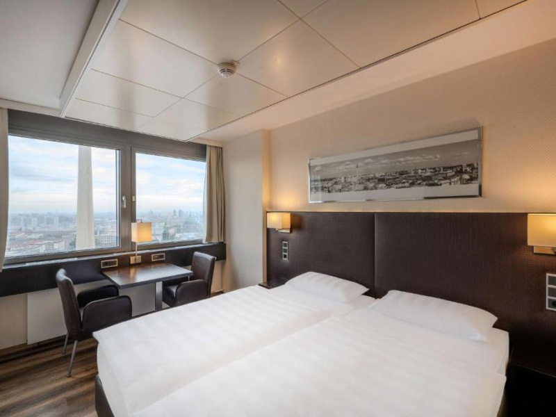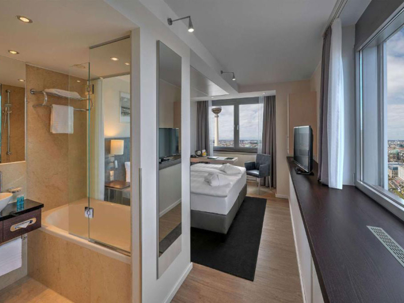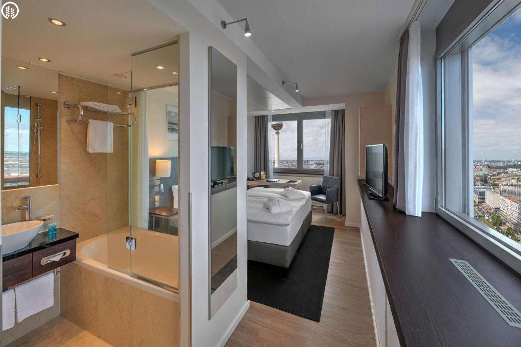A szálloda több mint 1000 szobával rendelkezik, amelyeket modern stílusban rendeztek be. A közlekedési kapcsolatok kiemelkedően jók, mivel az Alexanderplatz tömegközlekedési csomópont, amely U-Bahn, S-Bahn, villamos- és buszjáratokkal köti össze a város különböző pontjait. A busz szintén praktikus megoldás lehet, a negyed óránként közlekedő 100-as számú jármű kevesebb, mint 20 perc alatt a Reichstag épületéhez repít.