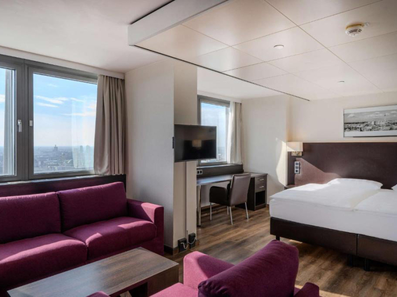 A Park Inn by Radisson Berlin Alexanderplatz egy ikonikus szálloda Berlin szívében, az Alexanderplatzon, amely a város egyik legforgalmasabb és legismertebb területe. Az 1970-ben épült, 37 emeletes, 125 méter magas épület Németország legmagasabb hotelje, és kiváló elhelyezkedéssel büszkélkedhet, mindössze pár lépésre a TV-toronytól és a város számos nevezetességétől. A Park Inn by Radisson Berlin Alexanderplatz 19 km-re található a Berlin Brandenburg repülőtértől. Az utazási idő autóval körülbelül 30-40 perc a forgalomtól függően. Tömegközlekedéssel a reptérről közvetlen vonatkapcsolat van az Alexanderplatzra, amely körülbelül 30-35 percet vesz igénybe.