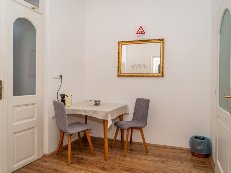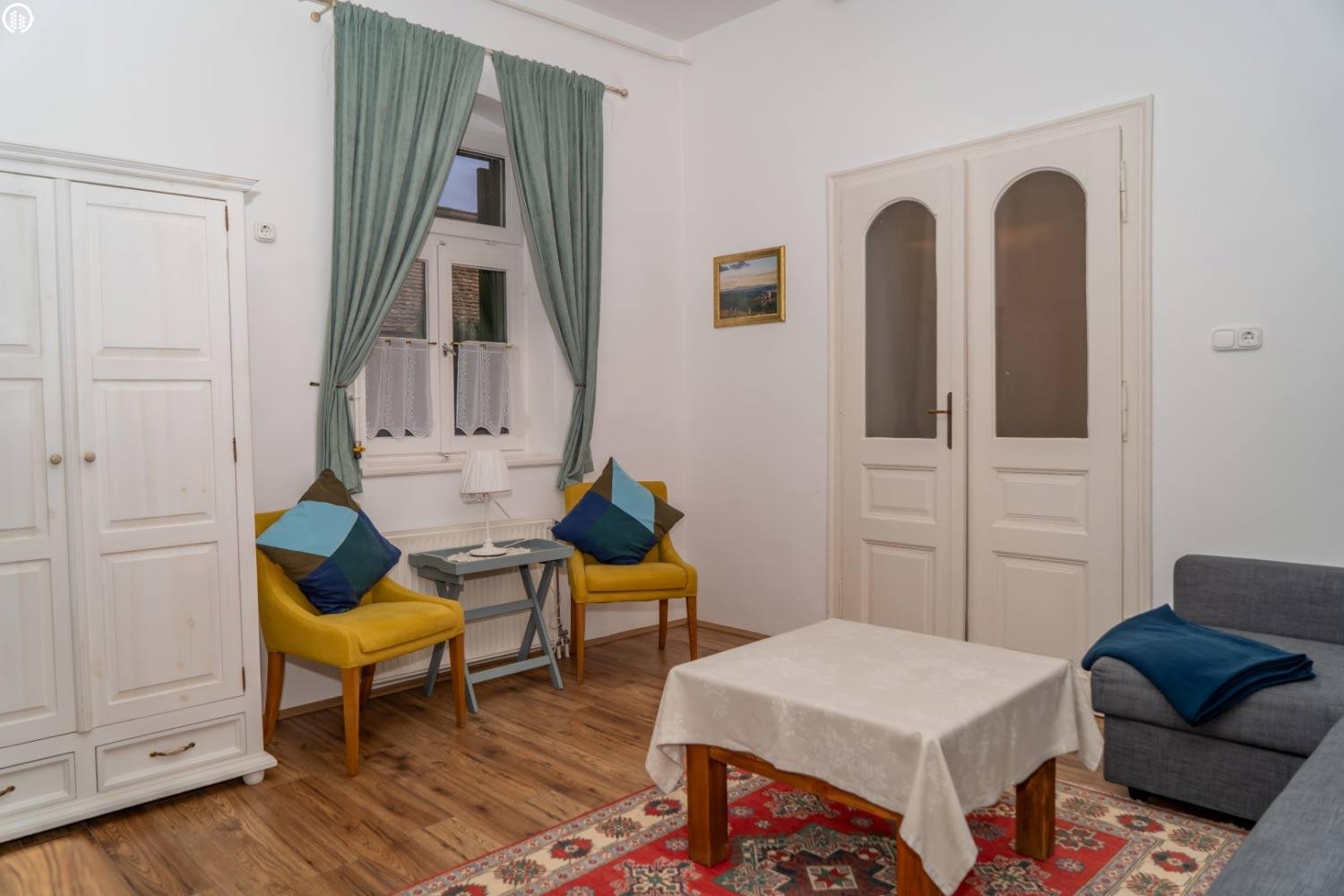A 4 fős apartmanhoz tartozik a tágas, és kényelmes nappali szoba, ahol a fürdőszoba, toalett helyezkedik el. Mindegyik apartmanhoz külön bejáratok – a parkoló és a belső kert felől – és saját használatú, kerti pihenőrészek tartoznak.