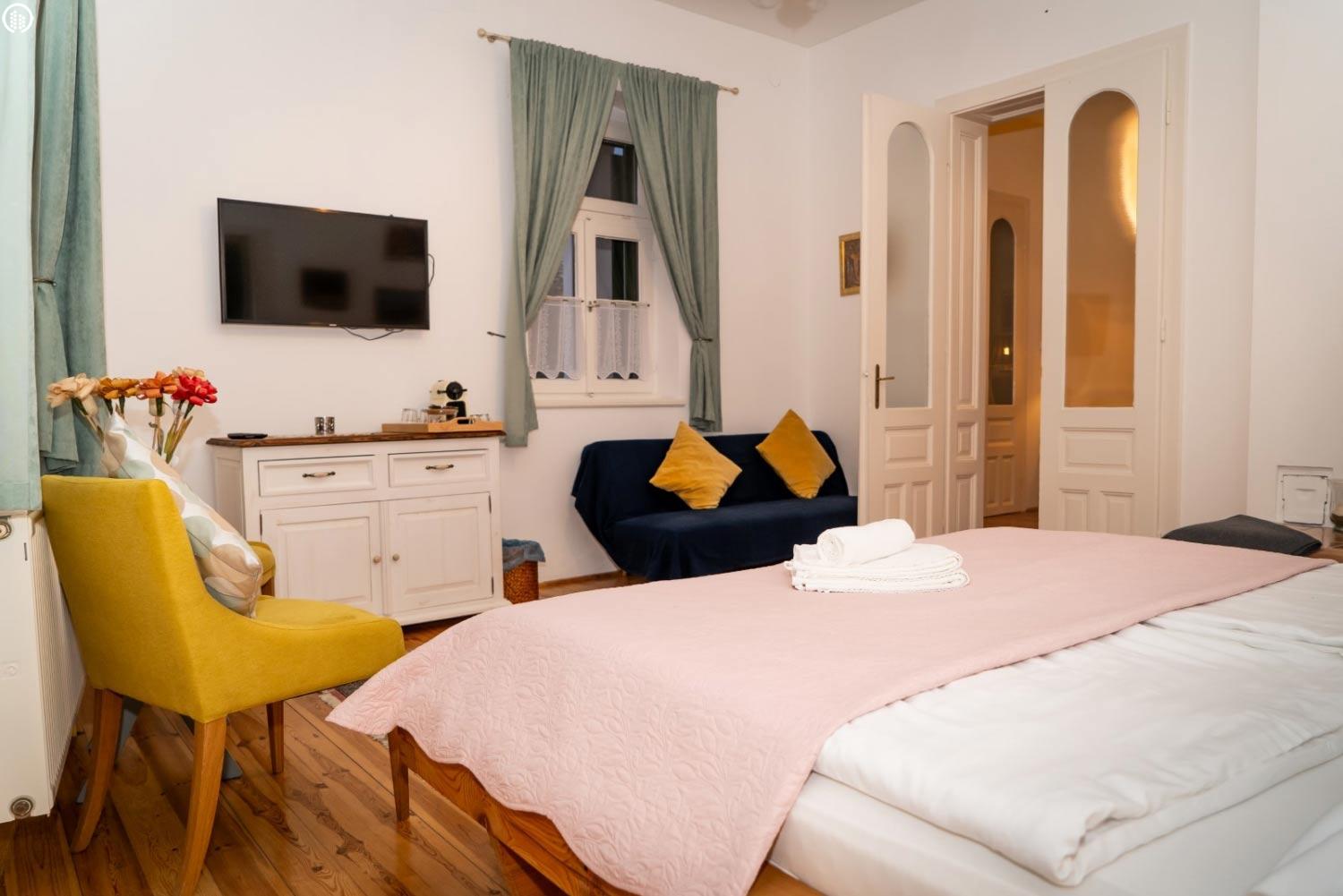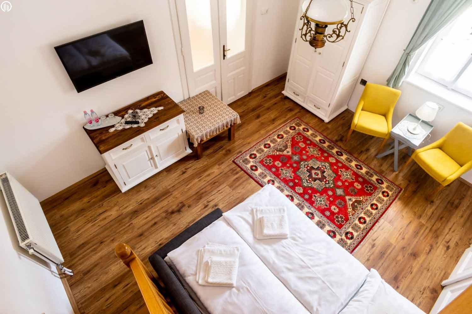 Az régi parasztházból kialakított szobák vastag falainak köszönhetően a nyári forróságban üdítően hűvösek, télen pedig bent tartják a meleget.