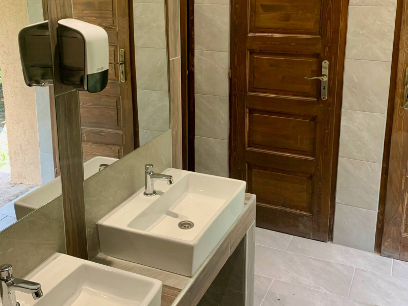 Tisztálkodás: a vizesblokk női és férfi részlegében összesen 8 zuhanyzó, 8 mosdó és 8 WC áll rendelkezésre.