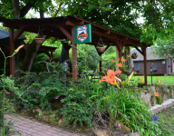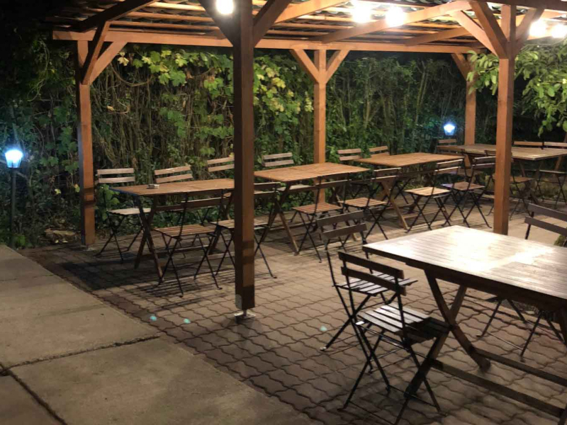 A diófával árnyékolt, fedett teraszon 40-45 fő kényelmesen elfér. Itt lehet az étkezést lebonyolítani, és itt ingyenes WIFI elérhetőség is biztosított.