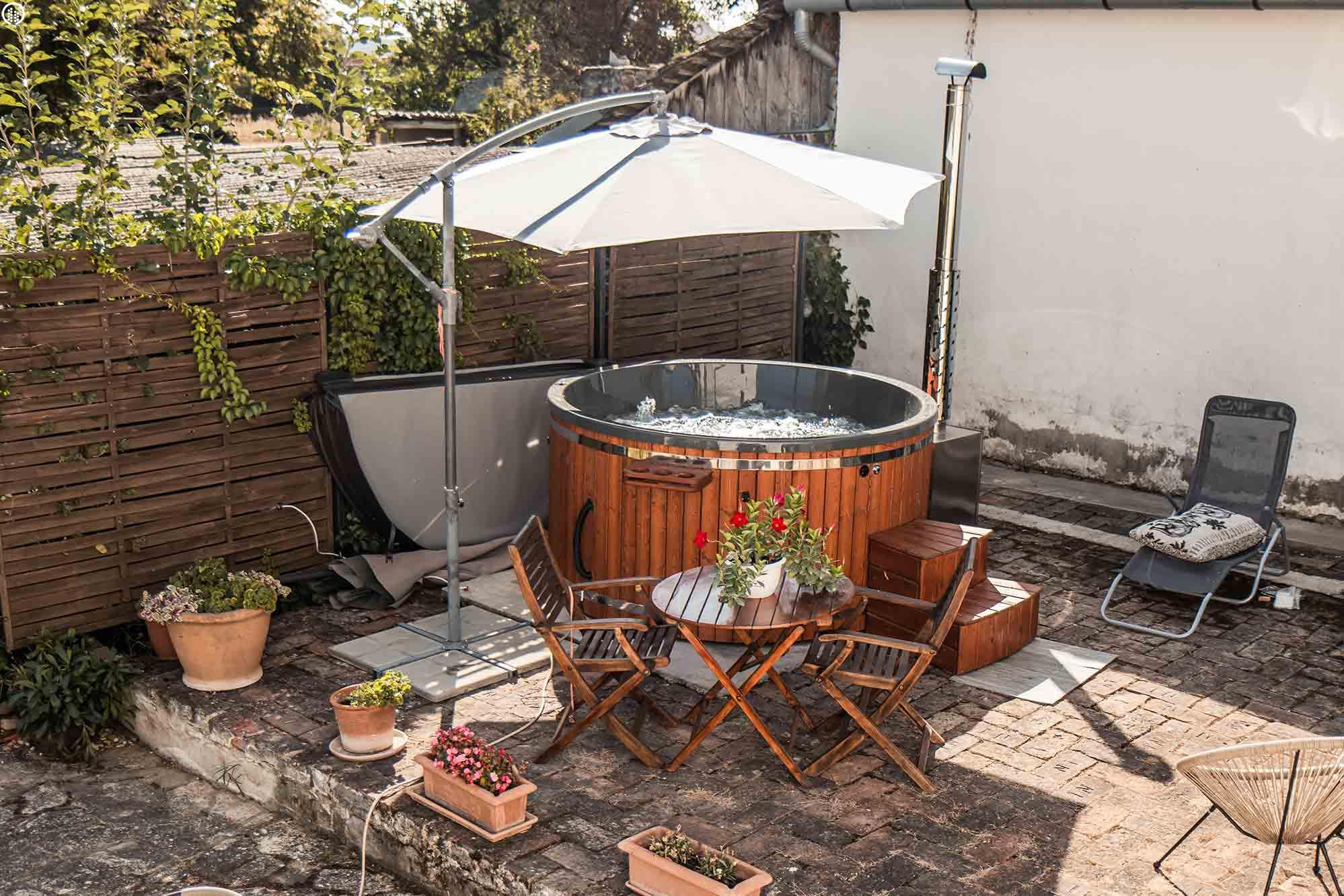 Az ablakon kinézve a hatalmas kert látványa terül a vendégek elé, melynek egyik fő eleme a pezsgőfürdős fatüzelésű dézsa.